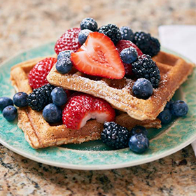 - Add fresh fruit and a light dusting of powdered sugar to each waffle, and serve.